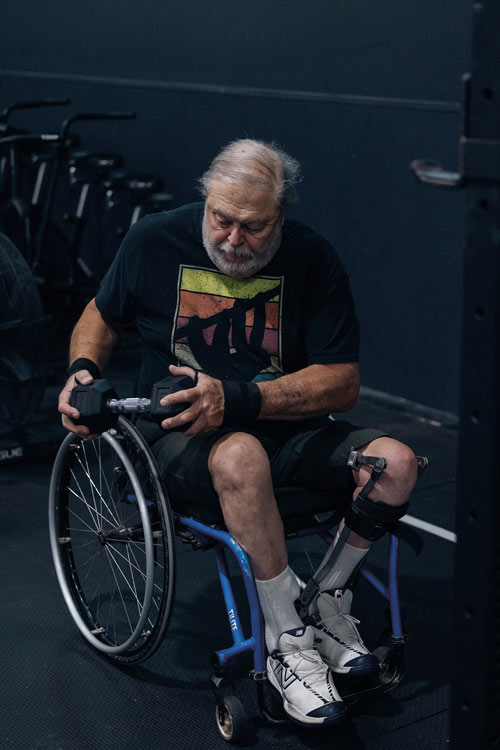 Some participants take their seats at the rowing machines, while those in wheelchairs roll into position to use the wall-mounted vertical ski machines. Twenty minutes go back on the clock as “Welcome to the Jungle” by Guns N’ Roses booms over the speakers.