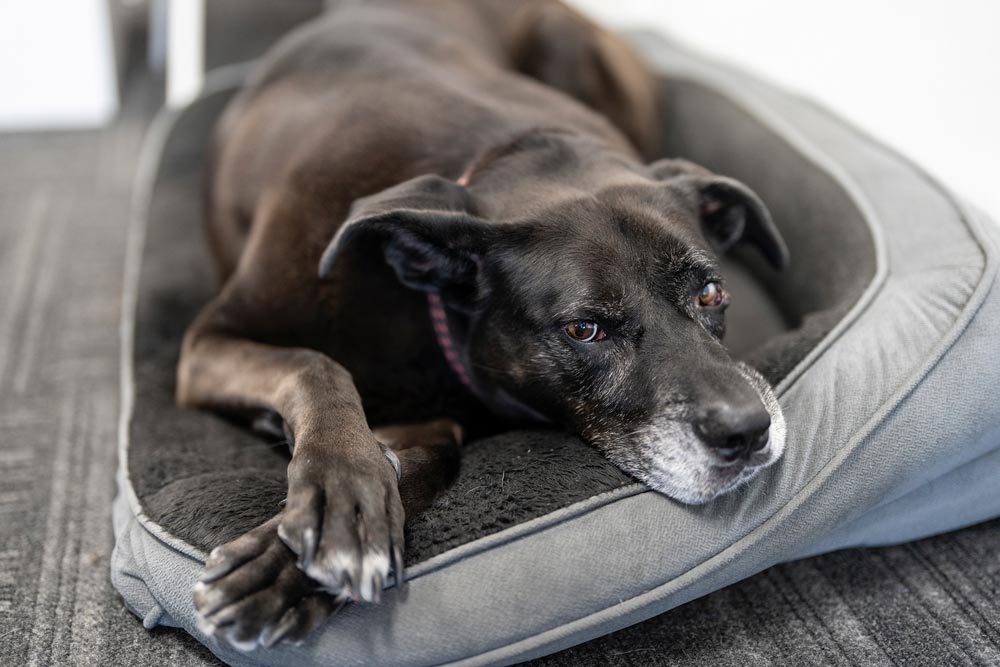 Lucy, a large black dog with just a bit of a gray beard, watches from her bed beneath an American flag in a corner, just beyond the black rubber flooring and exposed air ducts of the Kansas City gym.