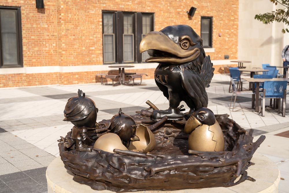 A new brood of Jayhawks has taken up residence outside the Kansas Union on Ascher Plaza. Unveiled in September, the “Jayhawk Nest” statue depicts three fledglings—including the 1912 Jayhawk—watched over by an elder bird.