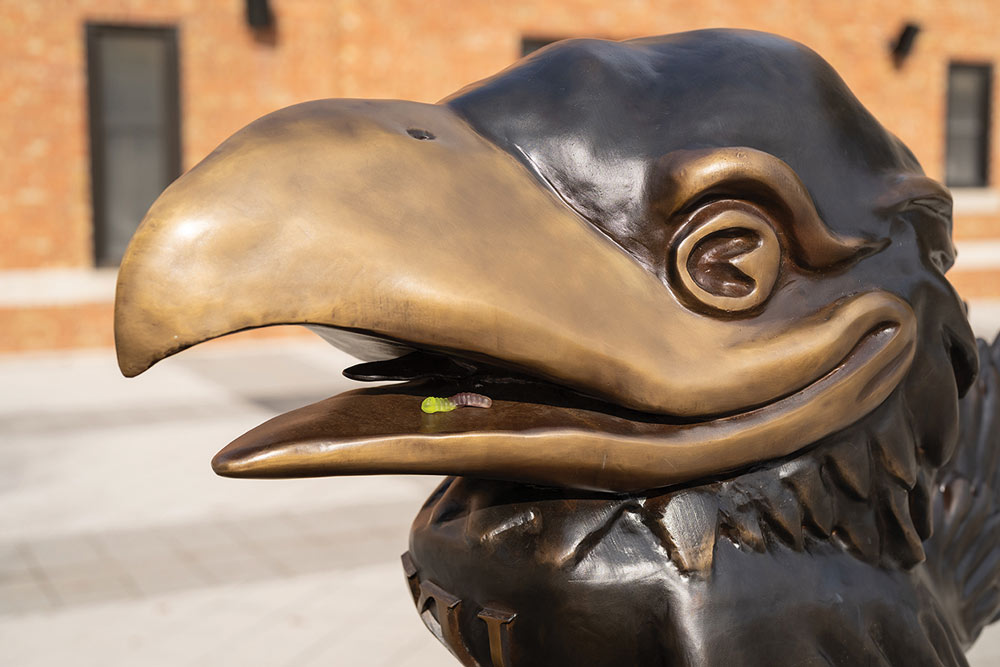 The monument joins the six other bronze Jayhawks sculpted by artist Robin Richerson to chronicle the mascot’s evolution. The entire flock was made possible by James Ascher Sr., ’51, and his family. Pleased with the first six statues, Ascher approached the Union about another work to represent new generations of Jayhawks.