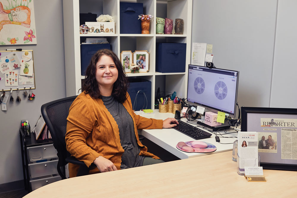 Johnson evaluates patients for hearing loss, tinnitus—a ringing in the ear—and a condition called auditory processing disorder, which relates to the brain’s interpretation of sounds. She also sees patients for hearing aid fittings and checks. Empathy and problem-solving are at the heart of her practice.