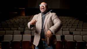 The most recent addition to the Gerren Hall of Achievement is Reginald Buckner, d’61, g’66, the great-uncle of Creston Herron, f’08, KU’s new director of orchestral activities. In April 2024, Herron conducted a special performance for Buckner’s extended family members to celebrate his induction, and every day Herron walks by his great-uncle’s photo in Murphy Hall, along with photos of the other Gerren Hall inductees.