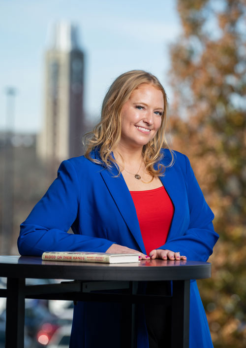 Matney is also proud of her Jayhawk roots and holds fast to the principles of good reporting instilled in her at KU. “The way we tell stories will change, but you still have to learn how to captivate an audience and get the information accurate, and those are skills that I absolutely took with me from KU and that provided a great foundation for my career,” she says. She looks back fondly, too, on the budding of lasting friendships and an environment that nurtured self-discovery. “I had the best memories at Anschutz with my girlfriends at like 3 in the morning,” she laughs. “I’m still a chronic procrastinator. I’ve learned to embrace it.” She is often up into the wee hours of the morning finishing podcast episodes, though she has traded her kitchen table setup for a professional recording booth in her home studio.