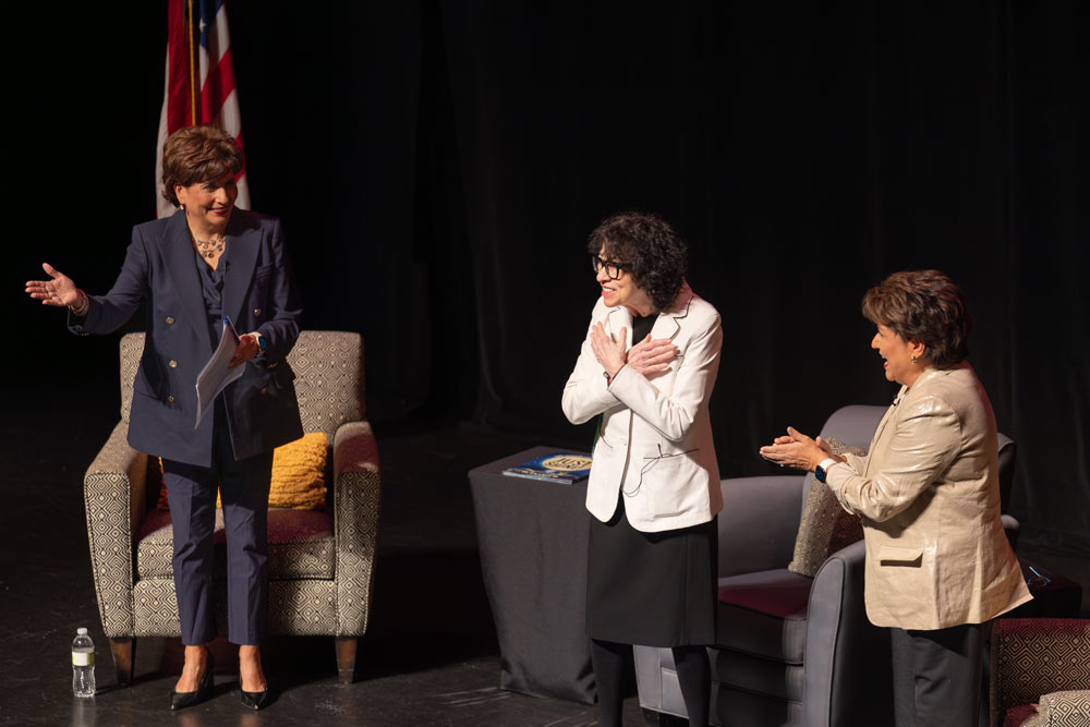 The discussion, which was hosted by the School of Law, was moderated by two Latina trailblazers in their own right, twin sisters and KU alumnae Mary and Janet Murguía. Mary Murguía, c’82, j’82, l’85, is the first Latina to serve as chief judge of the federal appellate court in the U.S., and Janet Murguía, c’82, j’82, l’85, serves as president and CEO of UnidosUS, the largest and one of the most influential Latino civil rights and advocacy organizations in the country. Other discussion topics included judicial discretion, the emergency docket, and Sotomayor’s dissent in Noem v. Vasquez Perdomo, which argued against profiling by federal agents.