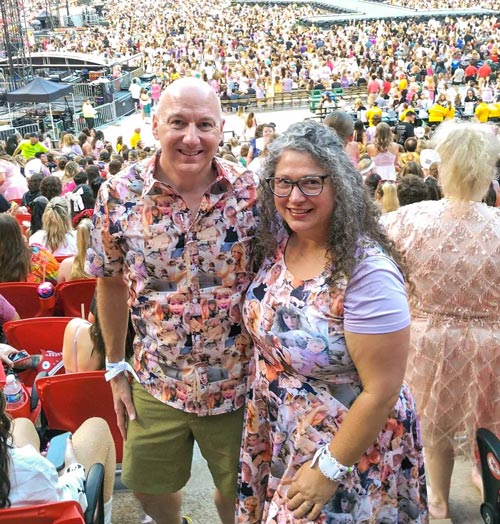 About 50 members of the KU Swift Society make it to an Arrowhead show—as does their faculty sponsor. Dressed in custom-made outfits that feature pictures of Swift with her cats, Brian and Natalie Donovan attend the Saturday concert. As the date approached, Donovan shared that he planned to go as a fan, but knew he’d likely be tempted to bring a notepad and pen to jot down some observations.