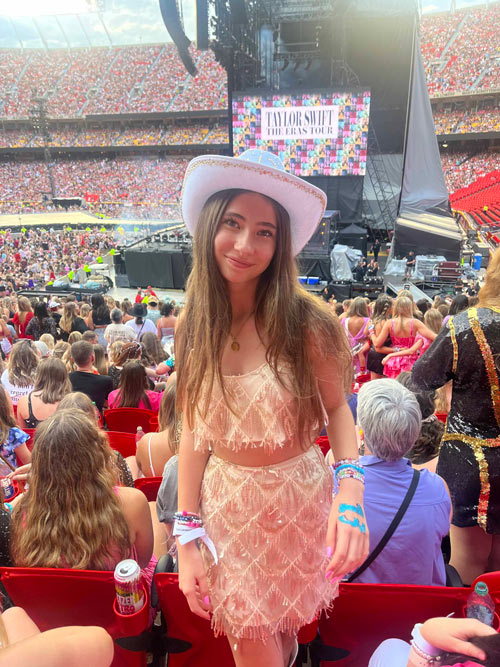 Somewhere in the sea of singing Swifties is Alexis Greenberg. She attends with her father, Greg Greenberg, b’96, who manned the online presale to snag tickets to both Kansas City and New Jersey shows, and who also accompanied his daughter to Swift concerts in 2015 and 2018. “He’s definitely a Swiftie dad,” Alexis says. “He lets us paint his nails and put glitter on his face. He recognizes and appreciates how the shows build community.”